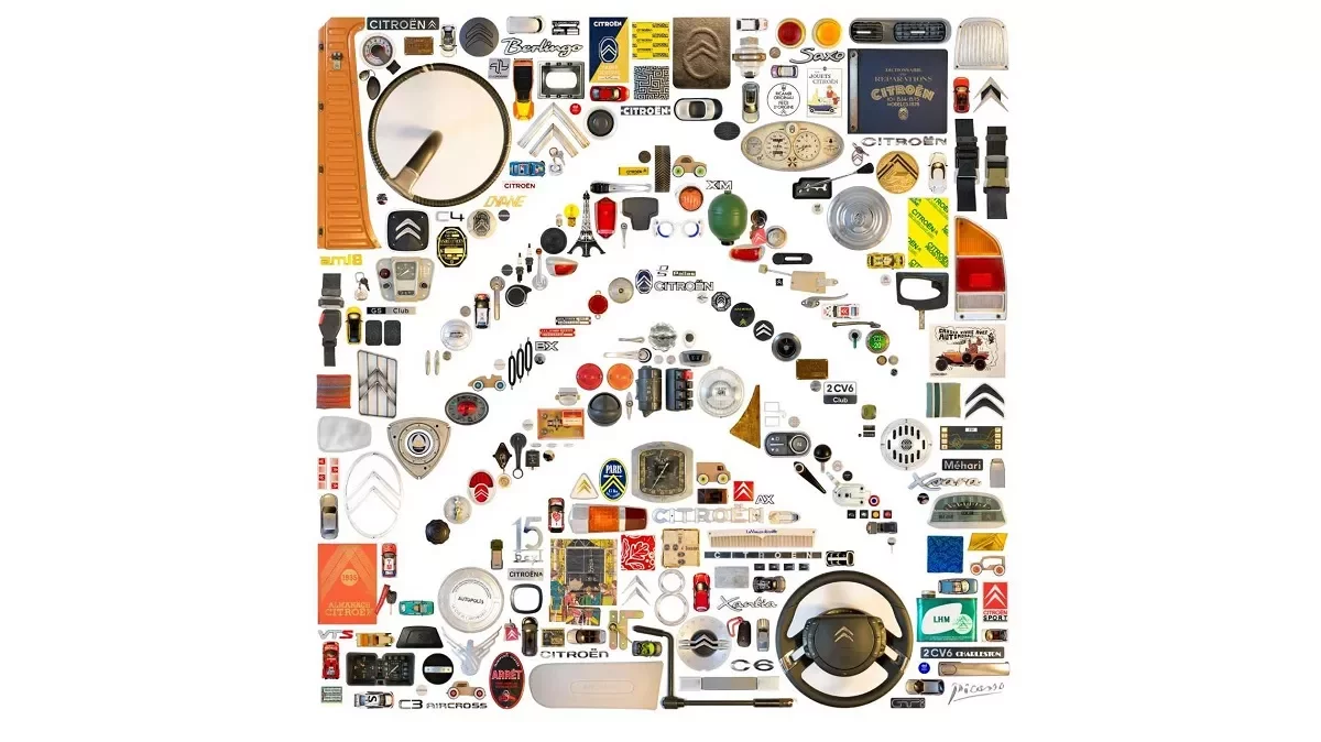Designér je milovníkem značky, sám vlastní několik vozů z různých období. Pro tuto příležitost kompletně prozkoumal sériové automobily, koncepční vozy, motoristický sport, ale také hračky, reklamy, logo Citroën a jeho vývoj v průběhu času, typografii značky… Výsledkem je nádherná koláž, z níž vystupují dvojité šípy tvořící logo, ale i vizuální slovník značky, který je snadno rozpoznatelný. Z dálky jde o plastiku moderního vzhledu, zblízka o shrnutí historie značky Citroën, která před našima očima dostává konkrétní podobu: