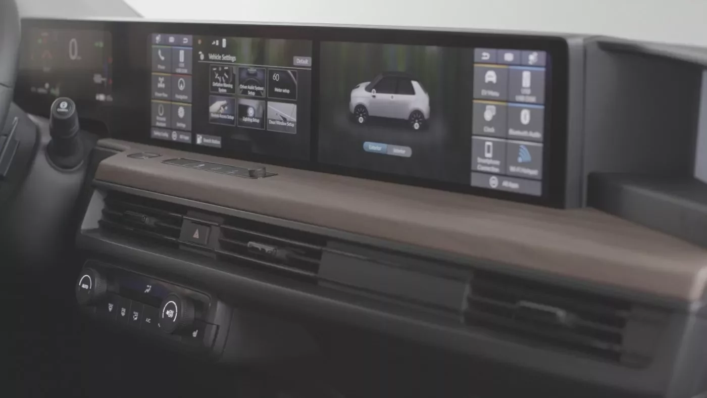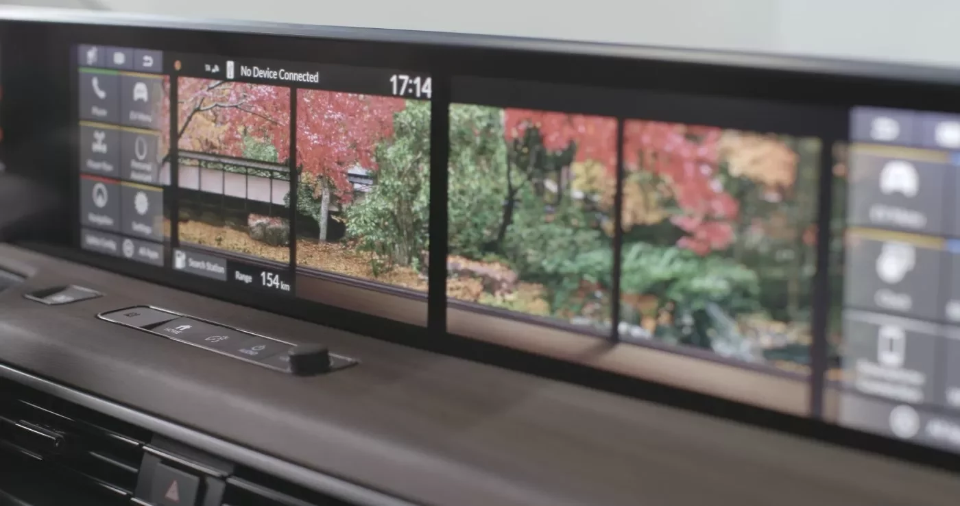 Digitální přístrojová deska po celé šířce vozu Honda e byla navržena s důrazem na bezproblémové používání propojených aplikací a služeb. Pět úhledně začleněných barevných obrazovek s vysokým rozlišením společně zabírá celou šířku interiéru vozu.